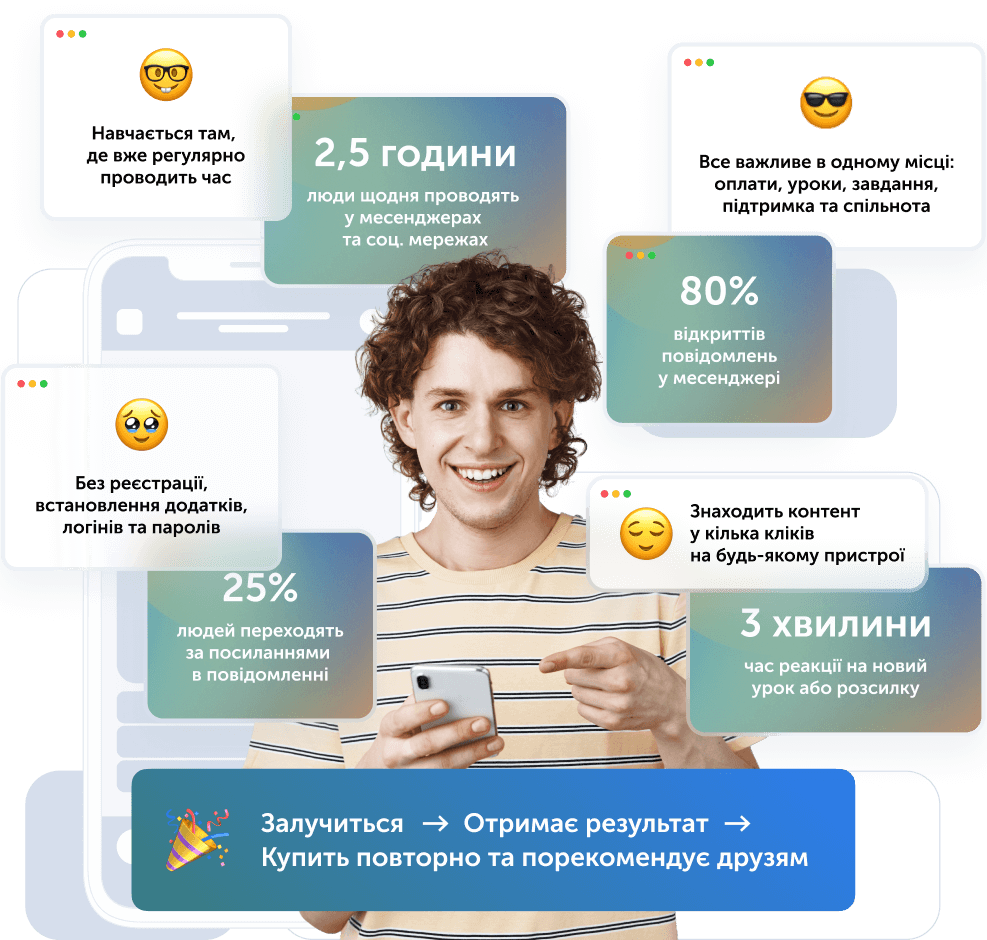 Марафон, курс, вебінар, наставництво або будь-який інший освітній продукт. Люди навчатимуться у звичному місці, без зайвих закладок у браузері та паролів.